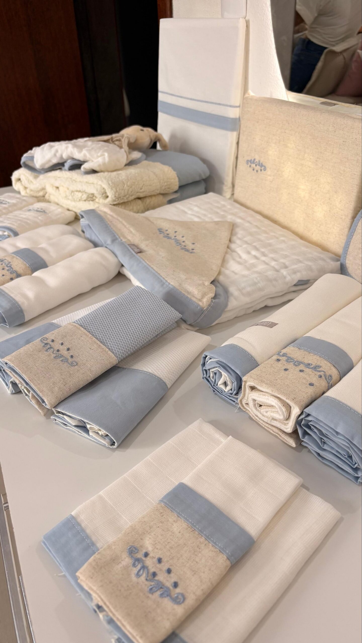 É um enxoval que transmite harmonia, leveza e sofisticação na medida certa, ideal para quem busca beleza, qualidade e um toque natural no quartinho. Um combo pensado para acolher o bebê com suavidade e amor. 💙🌿